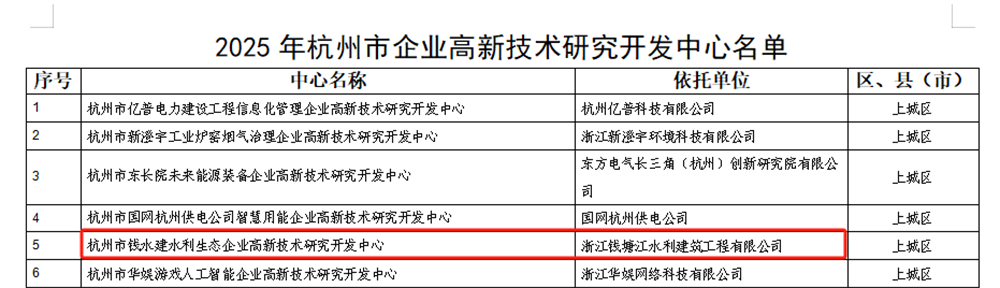 近日,由浙錢水建創(chuàng)建的杭州市錢水建水利生態(tài)企業(yè)高新技術(shù)研究開發(fā)中心,憑借其在水利工程技術(shù)創(chuàng)新領(lǐng)域的卓越表現(xiàn)和研發(fā)實力,成功入選2025年“杭州市企業(yè)高新技術(shù)研究開發(fā)中心”名單,這標(biāo)志著浙錢水建在技術(shù)研發(fā)、成果轉(zhuǎn)化及產(chǎn)業(yè)升級方面得到了市級創(chuàng)新平臺的充分認(rèn)可。