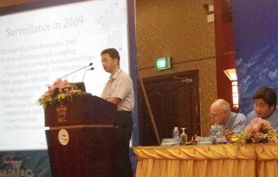 會議中,黃倢研究員做了題為“Epidemiological study on farmed shrimp in China”的報(bào)告,總結(jié)了黃海所呈報(bào)給世界動物衛(wèi)生組織(OIE)并已報(bào)道的對蝦疫病的流行病學(xué)研究進(jìn)展。黃海所科研人員還利用互聯(lián)網(wǎng),向中國水產(chǎn)科學(xué)院水產(chǎn)病害防治學(xué)科群全程呈現(xiàn)了報(bào)告和墻報(bào)的圖像,使水科院本學(xué)科人員實(shí)時(shí)了解到會議的內(nèi)容,提升了院內(nèi)本學(xué)科的學(xué)術(shù)氛圍,為全院同行及時(shí)跟蹤本學(xué)科的國際前沿動態(tài)提供了有價(jià)值的機(jī)會。
