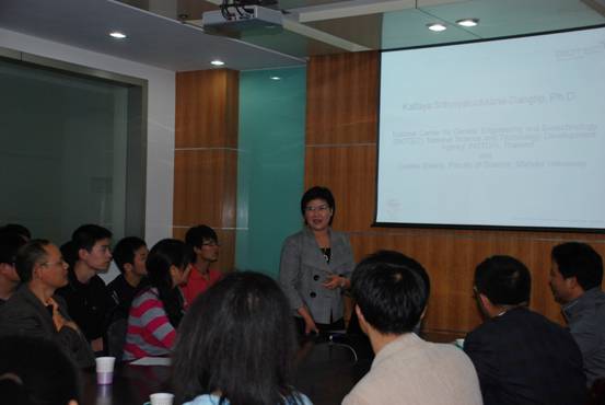 Dr. Kallaya Dangtip是 Centex Shrimp (泰國(guó)瑪希隆大學(xué)杰出人才中心對(duì)蝦研究組)的主要成員,主要從事對(duì)蝦免疫學(xué)及對(duì)蝦病毒致病機(jī)理研究,在該研究領(lǐng)域造詣?lì)H深。此前,黃海所病研室梁艷博士曾于2008年10月以交換研究者的身份在Centex Shrimp進(jìn)行為期了1年的合作研究,為雙方合作和交流起了良好的促動(dòng)作用。