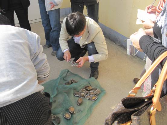 驗收專家組聽取了課題負責(zé)人的工作匯報、查閱了有關(guān)資料、進行了現(xiàn)場核查和取樣測量,一致確認:2010年在 3040 m2的育苗池中培育出平均殼長2.68cm(最大殼長 3.31cm,最小殼長 2.34cm)的鮑苗1570萬只,平均每平方米產(chǎn)鮑苗5170只;養(yǎng)殖18個月的成鮑平均殼長達到8.53厘米,成活率為93%;鮑苗和成鮑活力強,健康狀況良好。