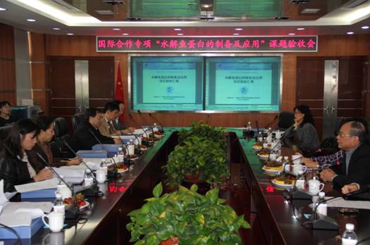 10月28日,受科技部國際合作司委托,青島市科技局組織專家對黃海所主持的科技部國際合作專項“水解魚蛋白的制備及應(yīng)用”項目進行了結(jié)題驗收。驗收專家組由中山大學(xué)、中科院水生生物研究所、中科院海洋研究所、中國農(nóng)業(yè)大學(xué)、中國海洋大學(xué)、青島科技大學(xué)等單位的七位專家組成。