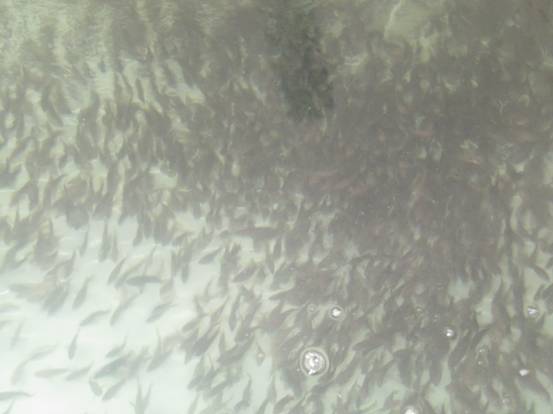 驗(yàn)收專家組認(rèn)真聽(tīng)取了課題組的工作匯報(bào),考察了萊州明波水產(chǎn)有限公司的生產(chǎn)現(xiàn)場(chǎng),查閱了相關(guān)生產(chǎn)及實(shí)驗(yàn)記錄,現(xiàn)場(chǎng)取樣計(jì)數(shù)了七帶石斑、云紋石斑親魚(yú)及苗種數(shù)量,測(cè)定了苗種全長(zhǎng)。確認(rèn):項(xiàng)目實(shí)施期間,課題組培育七帶石斑魚(yú)種魚(yú)369尾;云紋石斑魚(yú)種魚(yú)386尾;成功采用激素誘導(dǎo)獲得兩種石斑魚(yú)功能性雄魚(yú)轉(zhuǎn)化率分別為80%和95%。培育出七帶石斑魚(yú)苗10.7萬(wàn)尾(6.9cm-11.7cm),云紋石斑魚(yú)苗51.5萬(wàn)尾(4.2-8.9cm),云紋石斑魚(yú)(♀)×七帶石斑魚(yú)(♂)雜交魚(yú)苗1萬(wàn)尾(3.4-5.0cm)。
