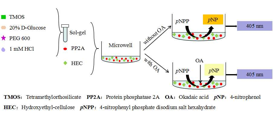 本發(fā)明涉及一種腹瀉性貝類毒素快速檢測試劑盒及其檢測方法,屬于水產(chǎn)品安全檢測領域。試劑盒包括:(1)包埋有蛋白磷酸酶2A(PP2A)酶凝膠的96孔微孔板;(2)大田軟海綿酸濃度梯度系列標準溶液;(3)緩沖溶液A;(4)緩沖溶液B;(5)底物顯色溶液;(6)質控樣品溶液。本發(fā)明采用改進的溶膠?凝膠技術將PP2A酶固定在微孔板底部,利用腹瀉性貝類毒素在堿性條件下抑制PP2A酶催化無色底物對硝基苯磷酸二鈉去磷酸化產(chǎn)生黃色產(chǎn)物對硝基苯酚(pNP)的反應,根據(jù)pNP在405 nm處吸光度與毒素濃度的劑量?反應關系對毒素進行定量檢測。本發(fā)明樣品前處理和檢測步驟簡單,操作技術要求不高,耗時較短、費用低廉、準確率高,適用于大批量貝類樣品中腹瀉性貝類毒素的快速篩查。