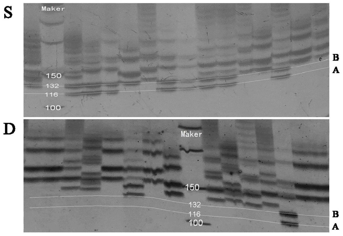 本發(fā)明涉及一個與紅鰭東方鲀耐低溫相關(guān)的微衛(wèi)星標記及其應(yīng)用,屬于魚類DNA標記技術(shù)與應(yīng)用領(lǐng)域,具體涉及紅鰭東方鲀耐低溫分子標記的篩選,以及利用標記進行分子標記輔助育種。利用BSA?SSR技術(shù)篩選到1個與紅鰭東方鲀耐低溫相關(guān)的微衛(wèi)星標記(fms108),其引物序列為正向:AACATGCGACAGAACTGACTG,反向:TCCACAGCCAATGTTAATGG。根據(jù)此標記可以進行育種親本的選擇,從而提高后代的耐低溫性能。