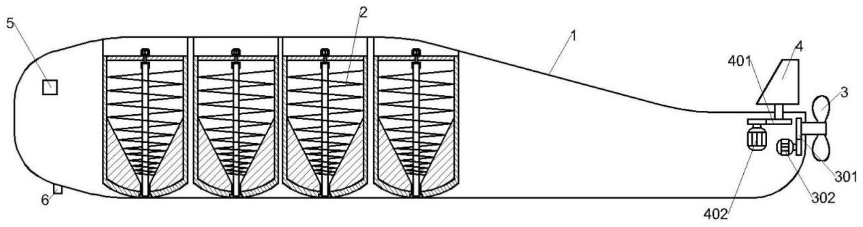 本發(fā)明涉及海洋漁業(yè)配套設(shè)施領(lǐng)域,尤其涉及一種潛水巡航式投餌裝置,包括外殼,所述外殼內(nèi)部設(shè)置有至少一個(gè)餌料投放組件,所述外殼外側(cè)設(shè)置有潛水結(jié)構(gòu),所述外殼后端設(shè)置有驅(qū)動(dòng)組件,所述外殼后端上方設(shè)置有轉(zhuǎn)向組件,所述外殼的前端內(nèi)部設(shè)置有控制模塊,所述控制模塊電性連接有數(shù)據(jù)收集模塊,所述控制模塊分別與所述餌料投放組件、驅(qū)動(dòng)組件、轉(zhuǎn)向組件電性連接;所述數(shù)據(jù)收集模塊用于監(jiān)測(cè)水下環(huán)境并觀察水下情況。