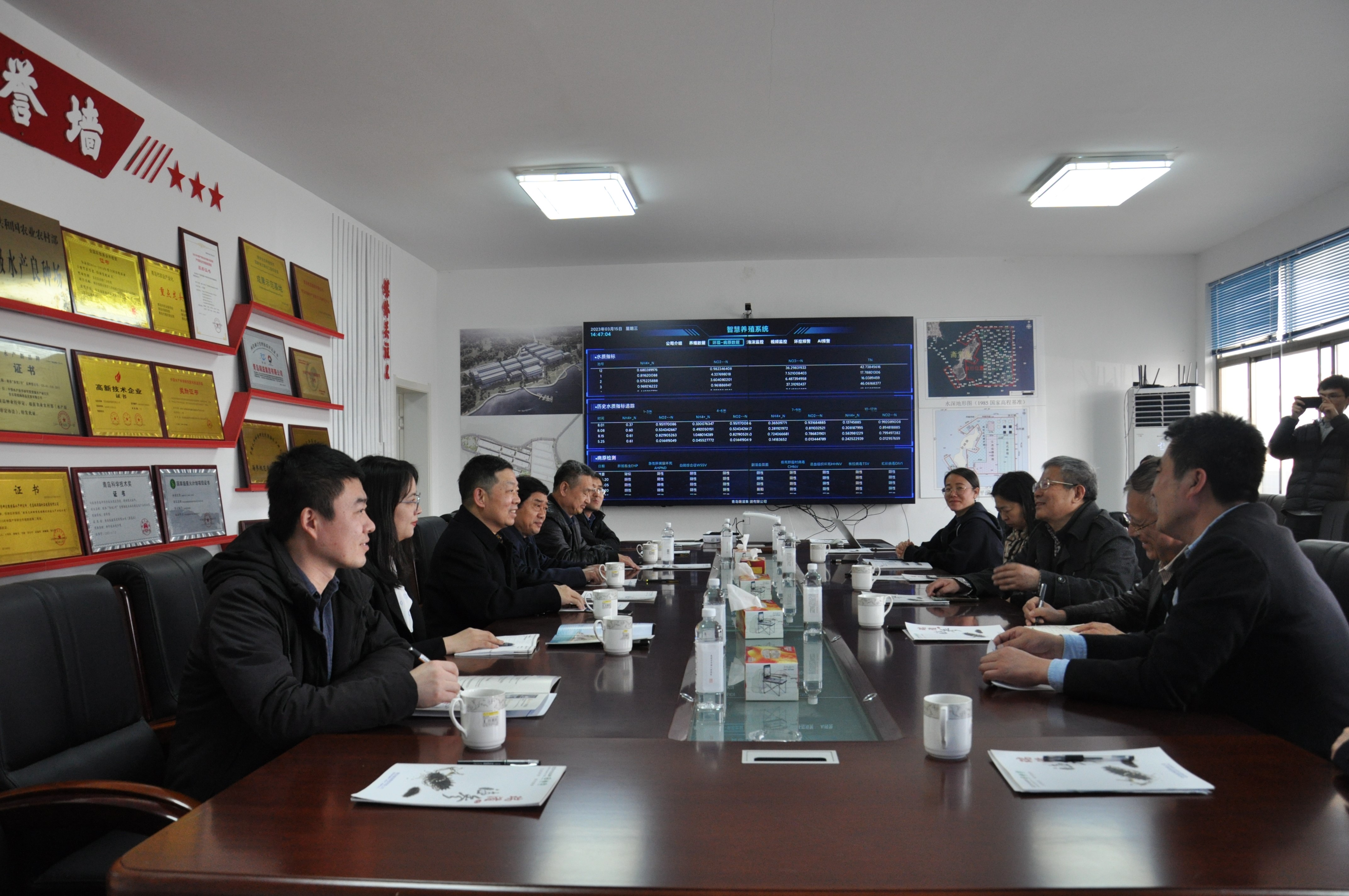 會(huì)議期間,盧兵友處長(zhǎng)、課題績(jī)效評(píng)價(jià)專家和參會(huì)人員還實(shí)地考察了在項(xiàng)目參與單位青島瑞滋集團(tuán)有限公司進(jìn)行技術(shù)示范的海水池塘智能化養(yǎng)殖裝備與自動(dòng)化管控平臺(tái)、“蝦(蟹)-貝(參/蜇)-魚(藻)”多營(yíng)養(yǎng)層次海水池塘生態(tài)工程化養(yǎng)殖模式。