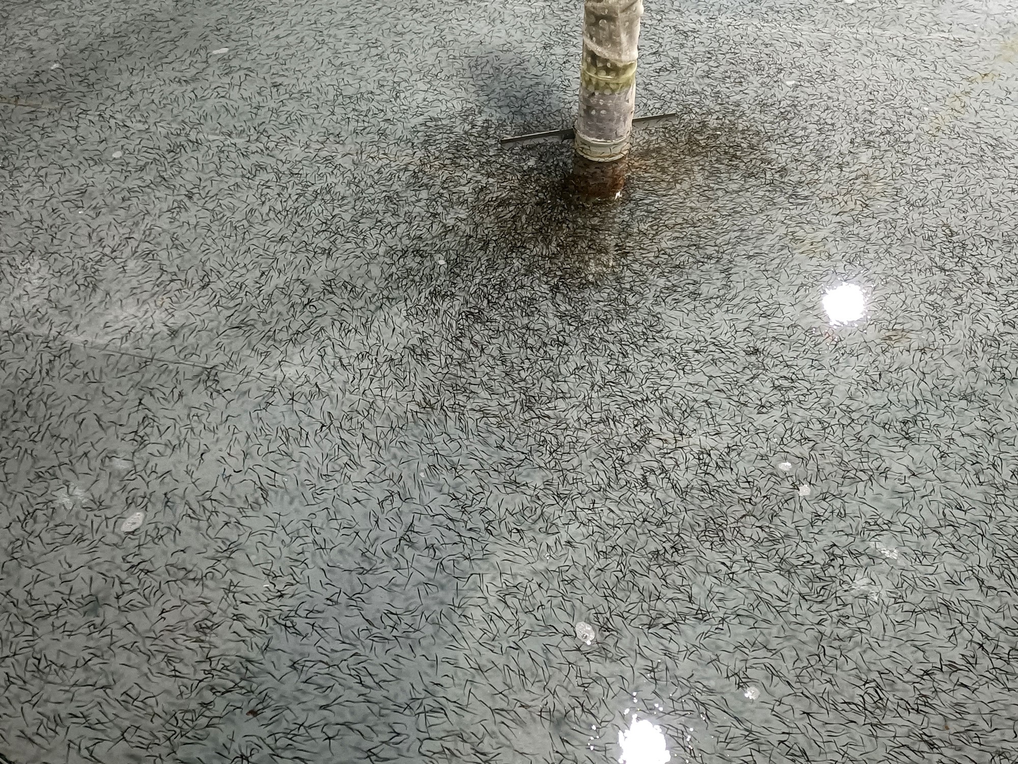 專家組聽取了項目工作匯報,查閱了相關(guān)資料,并對膨腹海馬親體、苗種的規(guī)格和數(shù)量進(jìn)行現(xiàn)場核查。結(jié)果顯示,該項目共保有親體2.43萬尾,養(yǎng)殖密度達(dá)203尾/m3;個體全長范圍12~17 cm,平均全長14.4 cm;體質(zhì)量范圍8.2~13.2 g,平均體質(zhì)量10.49 g。項目累計培育苗種數(shù)量125萬尾,培育密度2139尾/m3;苗種全長范圍2.4~7.1 cm,平均全長4.2 cm;體質(zhì)量范圍0.02~0.7 g,平均體質(zhì)量0.2 g。各項指標(biāo)均符合驗收標(biāo)準(zhǔn)。