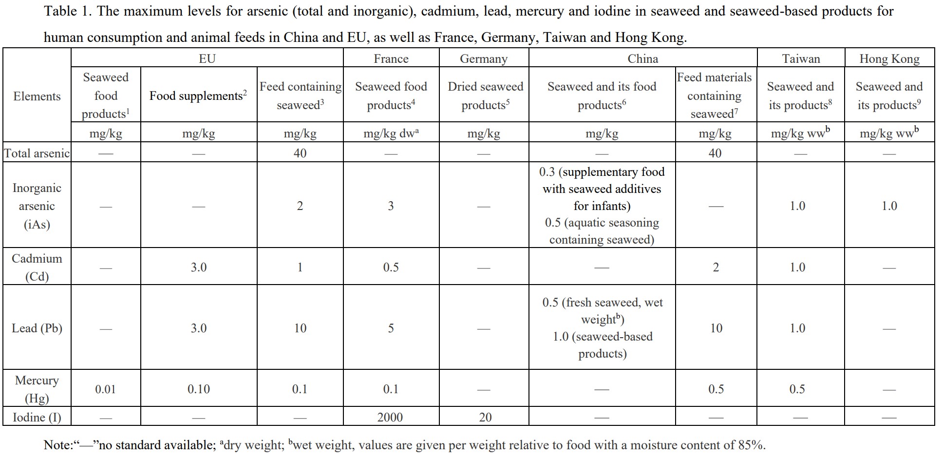 黃海水產(chǎn)研究所水產(chǎn)品質(zhì)量安全評價與標(biāo)準(zhǔn)團(tuán)隊(duì)圍繞海藻中重金屬、無機(jī)砷及碘等元素的風(fēng)險評估與限量標(biāo)準(zhǔn)開展了長期研究。本綜述論文全面分析了中國、歐盟等國家/地區(qū)對海藻食品、以海藻為主要原料的膳食補(bǔ)充劑、食品添加劑和飼料等不同類型產(chǎn)品中重金屬(鎘、鉛、汞)、砷和碘等元素的限量標(biāo)準(zhǔn)和技術(shù)法規(guī)的差異性,對海藻產(chǎn)品中潛在危害元素的總量、賦存形態(tài)、生物利用度、膳食暴露量等國內(nèi)外研究進(jìn)展進(jìn)行了系統(tǒng)總結(jié)和評論。