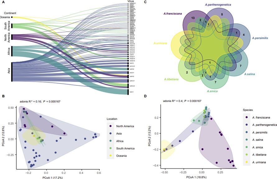 D:不同鹵蟲(chóng)種間RNA病毒分布PCoA圖