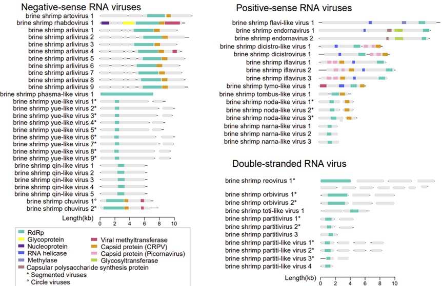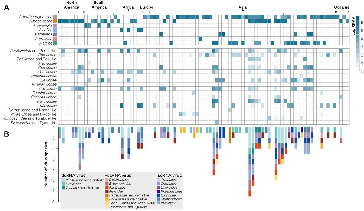 高鹽生態(tài)系統(tǒng)包括鹽湖、鹽沼等,具有高鹽度、高冰點(diǎn)和溶氧變化快等特點(diǎn),被視為“極端生態(tài)系統(tǒng)”。鹵蟲(chóng)(Artemia)為廣鹽性生物,在全球高鹽生態(tài)系統(tǒng)中均有分布,是水產(chǎn)養(yǎng)殖中重要的生物餌料。該研究對(duì)1977-2019年收集自六大洲、21個(gè)國(guó)家和100多個(gè)采樣地的143批鹵蟲(chóng)卵樣本開(kāi)展病毒組分析,鑒定到可歸類(lèi)為18個(gè)不同病毒家族和相關(guān)類(lèi)群的55種新型RNA病毒,分析揭示出一些病毒間存在全球聯(lián)系,特別是在亞洲和北美洲之間,發(fā)現(xiàn)人類(lèi)活動(dòng)可能推動(dòng)了這些病毒間的全球關(guān)聯(lián)性。研究揭示了鹵蟲(chóng)中病毒的多樣性,為了解全球高鹽生態(tài)系統(tǒng)中以前未被認(rèn)識(shí)的RNA病毒圈提供了新的見(jiàn)解。