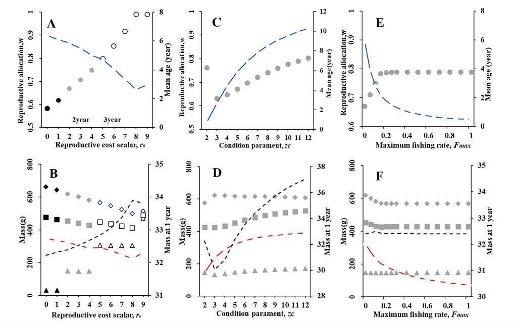 不同能量繁殖成本和死亡率下最優(yōu)繁殖分配(A, C, E)和生命史特征 (B, D, F)的變化