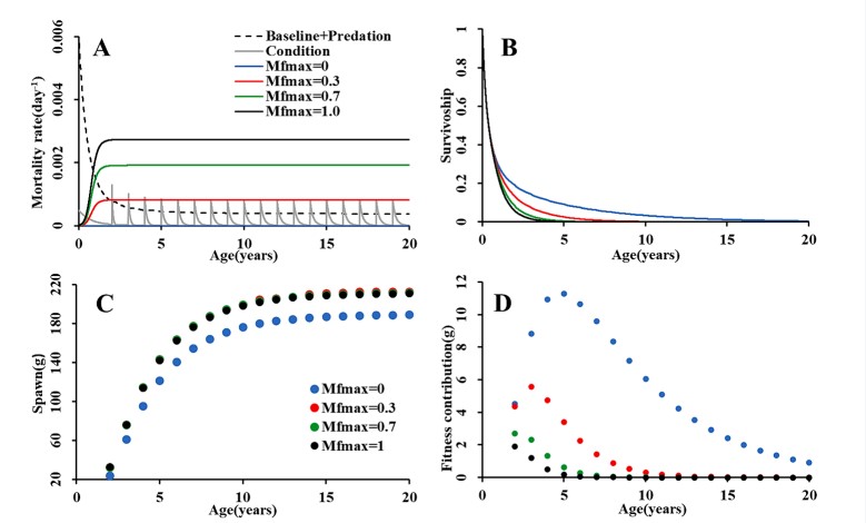 在不同的捕撈壓力下,小黃魚(yú)的死亡率(A)、存活率(B)、產(chǎn)卵量(C)和不同年齡的適應(yīng)度貢獻(xiàn)(D)