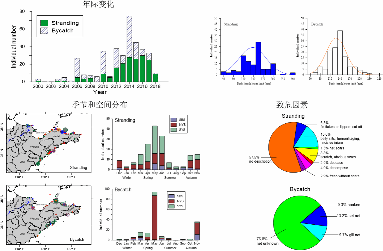 圖3.山東沿岸東亞江豚擱淺和誤捕的時空分布和致危因素