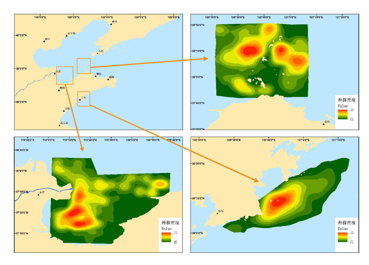 首先,團隊經(jīng)過多年科學探索,已成功構建了適用于黃、渤海的東亞江豚種群動態(tài)野外監(jiān)測方法,完成了逾20,000km航程的種群調(diào)查,查明了東亞江豚的分布熱點區(qū)和種群數(shù)量。確認渤海萊州灣(黃河口)海域、長島海域和青島的嶗山灣海域是東亞江豚的重要棲息地(圖1),估算渤海灣東亞江豚種群數(shù)量為5000頭,山東半島沿岸的東亞江豚種群數(shù)量約為15000頭。