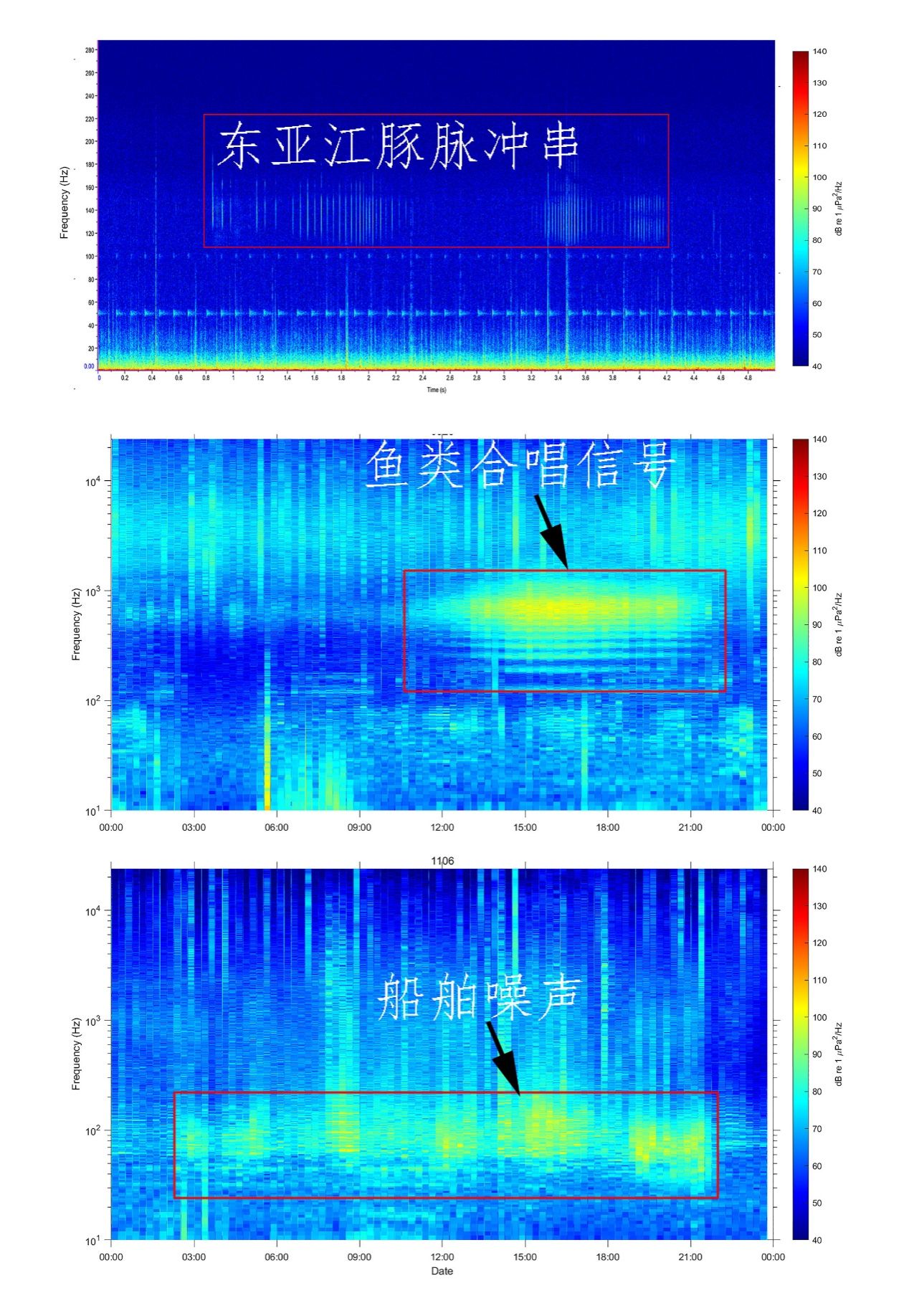 圖2.東亞江豚回聲定位信號脈沖串、發(fā)聲魚類合唱、船舶噪聲聲譜圖