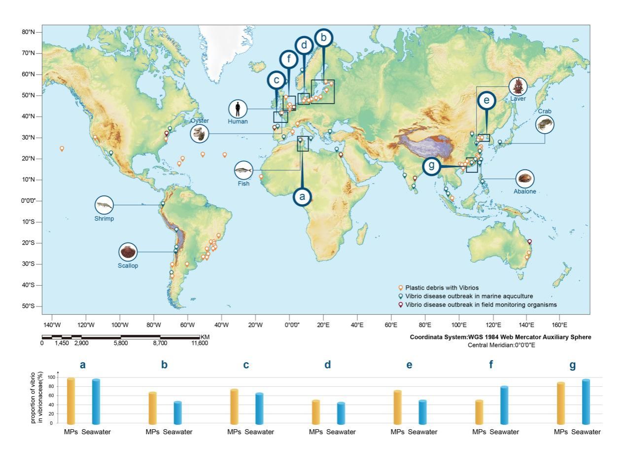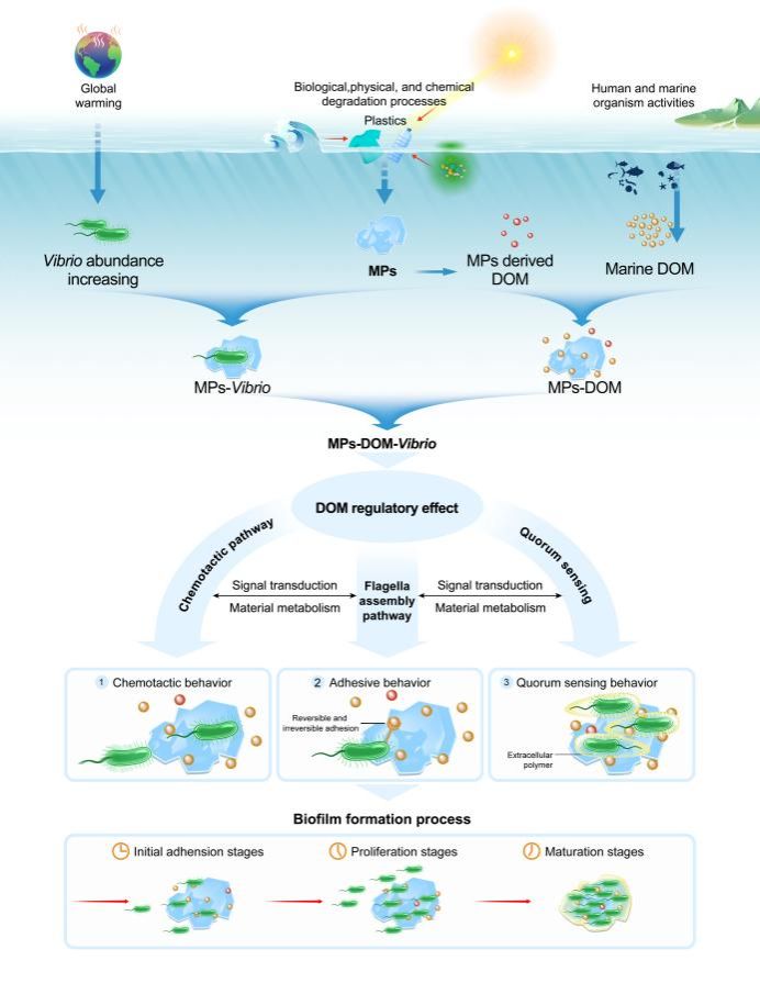全球微塑料污染日益嚴峻,其對海洋生態(tài)系統(tǒng)的潛在影響備受關注。微塑料表面形成的特殊微生物群落——“塑料圈”(Plastisphere),可能成為病原微生物(如病原性弧菌等)的載體,對海洋生態(tài)健康和水產(chǎn)養(yǎng)殖安全構(gòu)成威脅。深入理解微塑料-弧菌的相互作用及其生態(tài)風險,對保護海洋環(huán)境與人類健康意義重大。