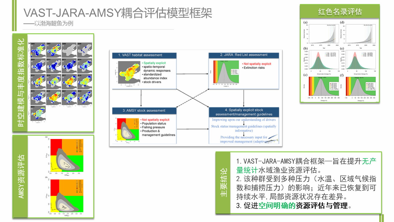 當(dāng)前,全球漁業(yè)廣泛采用的數(shù)據(jù)需求適中的資源評估模型通常無法輸出資源空間結(jié)構(gòu)信息,導(dǎo)致管理策略難以應(yīng)對局部資源波動風(fēng)險。針對這一國際難題,團隊創(chuàng)新性地提出了一個“時空分布-種群評估”耦合模型框架(coupled VAST-JARA-AMSY framework),成功破解了傳統(tǒng)評估模型缺乏空間維度的難題。該研究首次實現(xiàn)了數(shù)據(jù)中度漁業(yè)(data-moderate fisheries)的 “空間-狀態(tài)-風(fēng)險”聯(lián)動評估,為渤海乃至全球面臨類似數(shù)據(jù)挑戰(zhàn)的漁業(yè)資源管理提供了可復(fù)制的工具。