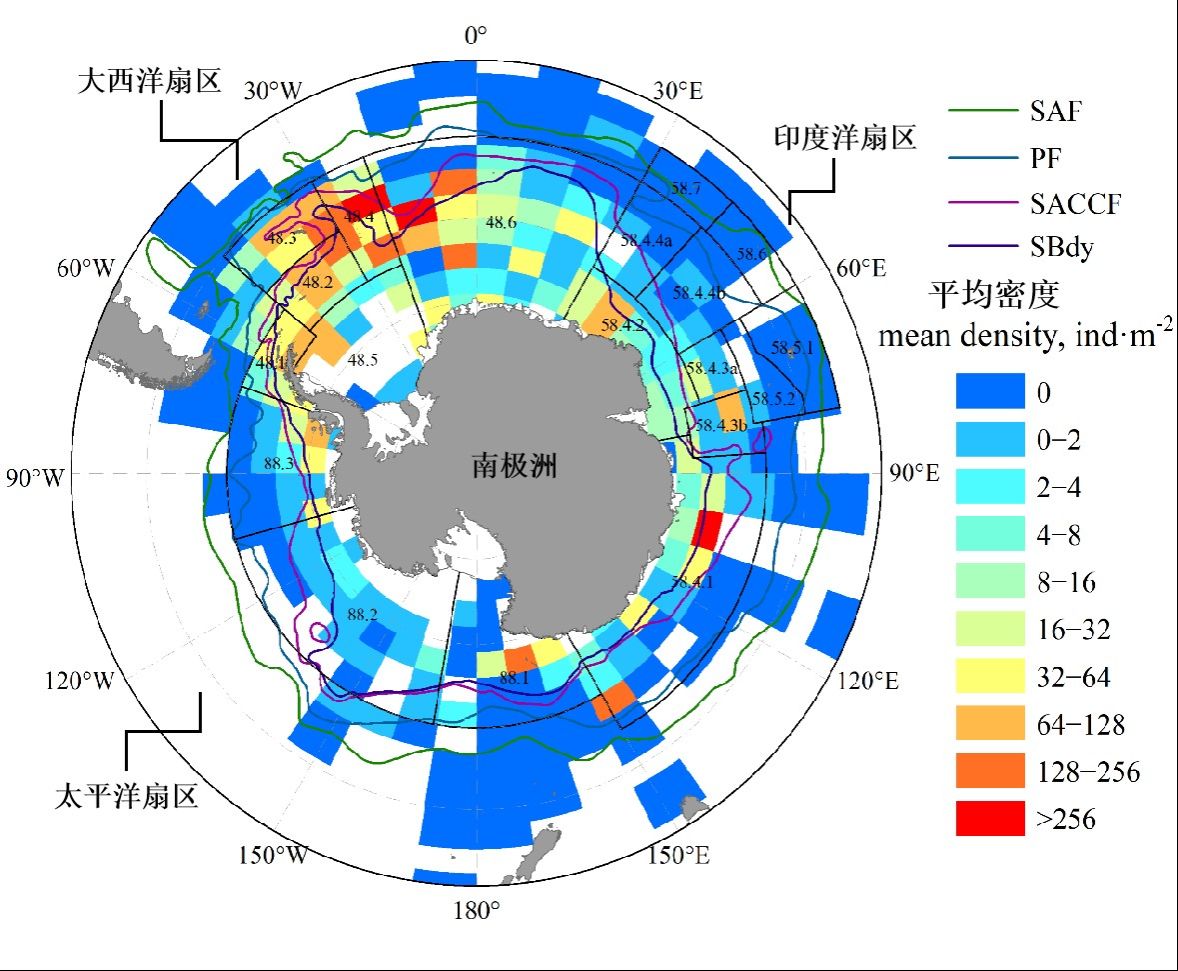 南大洋南極磷蝦資源密度及主要鋒面分布示意圖