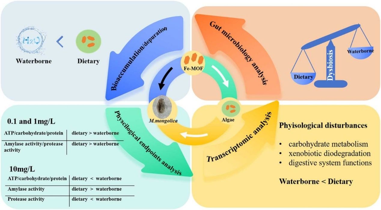 MOFs在環(huán)境修復(fù)、催化等領(lǐng)域展現(xiàn)出良好的應(yīng)用潛力,但其生態(tài)安全性尚待系統(tǒng)評(píng)估。目前研究多集中于MOFs對(duì)單一生物個(gè)體的毒性效應(yīng),而關(guān)于其在不同營(yíng)養(yǎng)級(jí)之間的傳遞規(guī)律及不同暴露途徑對(duì)毒性貢獻(xiàn)的認(rèn)識(shí)尚不清楚。本研究選取典型鐵基MOF材料(Fe-MOF, MIL-88B(Fe))為研究對(duì)象,枝角類蒙古裸腹溞(Moina mongolica Daday)為受試生物,系統(tǒng)比較了水相暴露與膳食暴露兩種途徑下該材料的生物累計(jì)特征與毒性效應(yīng)。研究發(fā)現(xiàn),F(xiàn)e-MOF的生態(tài)毒性傳遞效應(yīng)具有濃度依賴性:在低濃度(0.1和1mg/L)下,藻類的存在減輕了Fe-MOF對(duì)蒙古裸腹溞關(guān)鍵生理功能(ATP生成、碳水化合物/蛋白質(zhì)合成及消化酶活性)的負(fù)面影響;而在高濃度(10mg/L)下,膳食暴露則表現(xiàn)出協(xié)同毒性效應(yīng),其生物累積量較水相暴露提高了44.6%。進(jìn)一步通過高分辨率16S rRNA測(cè)序分析發(fā)現(xiàn),高濃度暴露導(dǎo)致蒙古裸腹溞腸道菌群多樣性下降和群落結(jié)構(gòu)紊亂,且膳食暴露引起的微生態(tài)失調(diào)更為嚴(yán)重。轉(zhuǎn)錄組分析表明,膳食暴露還引起更顯著的代謝通路擾動(dòng),尤其表現(xiàn)在碳水化合物代謝、外源化合物生物降解及消化功能相關(guān)通路上。這表明初級(jí)生產(chǎn)者(藻類)能夠調(diào)節(jié)MOFs在食物鏈中的毒性傳遞,并在不同濃度下由保護(hù)作用轉(zhuǎn)變?yōu)閰f(xié)同增毒效應(yīng)。