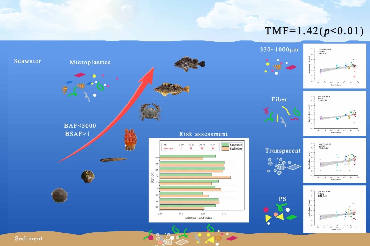 微塑料作為海洋環(huán)境中廣泛存在的新污染物,會(huì)通過(guò)營(yíng)養(yǎng)傳遞過(guò)程持續(xù)威脅海洋生態(tài)安全。然而,其自身特性如何在食物網(wǎng)中影響傳遞動(dòng)態(tài),目前尚不明確。本研究系統(tǒng)解析了桑溝灣生物體內(nèi)微塑料的累積特征、營(yíng)養(yǎng)級(jí)傳遞行為及其生態(tài)風(fēng)險(xiǎn)。研究發(fā)現(xiàn),生物體內(nèi)微塑料的尺寸、聚合物類型、形狀和顏色等特征與周圍水體及沉積物中的微塑料組成相似,表明環(huán)境暴露是其生物累積的主要來(lái)源。通過(guò)生物累積系數(shù)(BAF)和生物-沉積物富集因子(BSAF)分析表明,沉積物來(lái)源的微塑料對(duì)生物累積的貢獻(xiàn)顯著高于水體來(lái)源。此外,營(yíng)養(yǎng)級(jí)放大系數(shù)(TMF)大于1,表明微塑料在食物網(wǎng)中存在顯著生物放大作用,且該效應(yīng)在小尺寸、纖維與薄膜形狀、透明顆粒及聚苯乙烯成分微塑料中尤為顯著。污染負(fù)荷指數(shù)(PLI)評(píng)估顯示,桑溝灣表層海水和沉積物中微塑料污染處于低風(fēng)險(xiǎn)水平。研究結(jié)果為理解微塑料在海洋食物網(wǎng)中的生物累積與生物放大潛力提供了重要依據(jù),并明確微塑料的物理化學(xué)特性是影響其營(yíng)養(yǎng)級(jí)放大作用的關(guān)鍵因素(Sui et al., 2025, Journal of Hazardous Materials)。