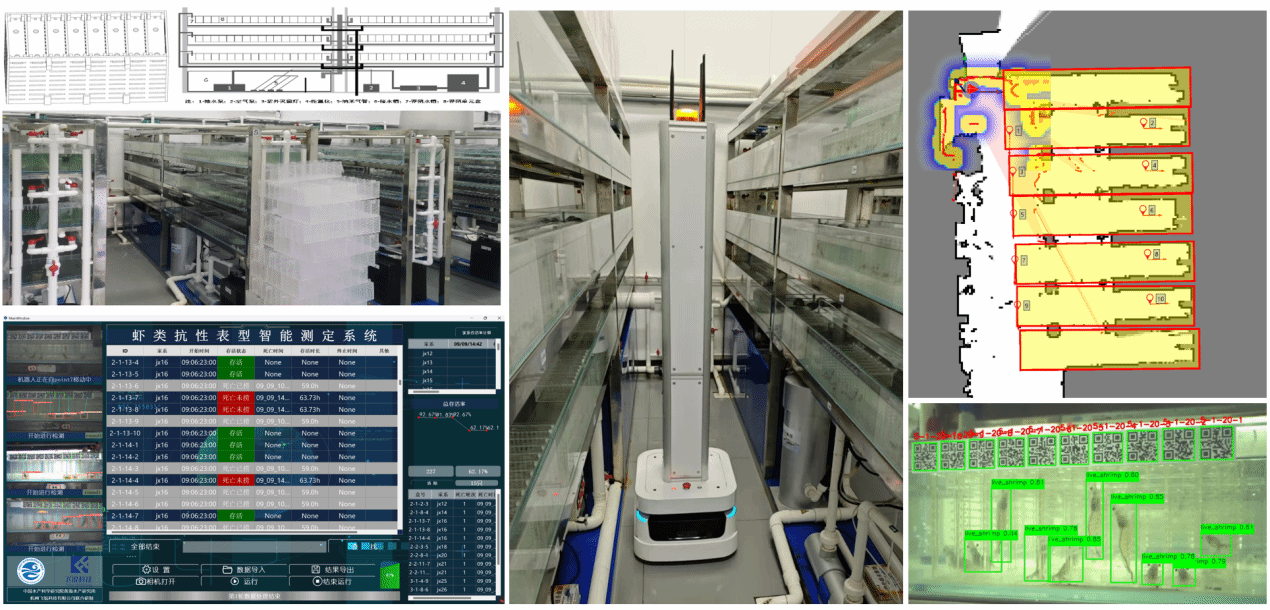 對蝦的抗病性狀屬于一種較難測量的性狀,傳統(tǒng)方法耗費(fèi)大量人力,需要24小時不間斷地觀察、記錄上千尾對蝦感染后的狀態(tài),并且人工統(tǒng)計(jì)和記錄引入的誤差非常普遍。獲取抗性表型數(shù)據(jù)庫效率低、不準(zhǔn)確是制約抗性育種的一個重要因素。針對上述問題,黃海所在原有的抗性測試系統(tǒng)的基礎(chǔ)上,開發(fā)了一套智能化、自動化的測定系統(tǒng)。通過機(jī)器人自動行走、工業(yè)攝像頭采集圖像數(shù)據(jù)、二維碼標(biāo)記識別個體、機(jī)器學(xué)習(xí)模型判斷存活狀態(tài)等多個技術(shù)模塊的開發(fā)和組合,實(shí)現(xiàn)對感染個體存活時間的精準(zhǔn)判定和記錄,有效解決了抗性測試費(fèi)人費(fèi)力且準(zhǔn)確度低等問題,同時檢測速度達(dá)到了高通量水平,可以一次進(jìn)行更多個體的測試,進(jìn)一步增加了抗病性狀獲取的一致性和可比性。