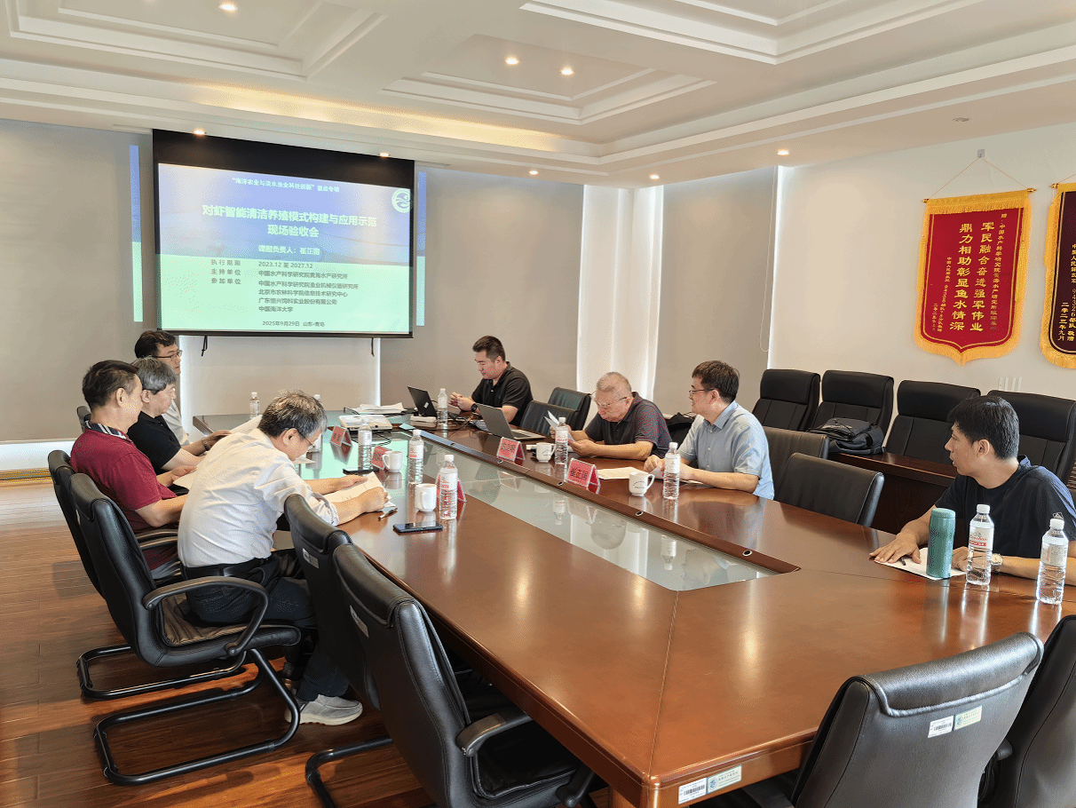 9月29日,中國水產科學研究院黃海水產研究所組織有關專家對國家重點研發(fā)計劃項目“陸基工廠化養(yǎng)殖關鍵技術與智能化裝備(2023YFD2400400)”課題3“對蝦智能清潔養(yǎng)殖模式構建與應用示范(2023YFD2400403)”階段性成果進行了現(xiàn)場驗收,驗收專家組由山東省海洋科學研究院、中國科學院海洋研究所、青島通用水產養(yǎng)殖有限公司等單位專家組成。