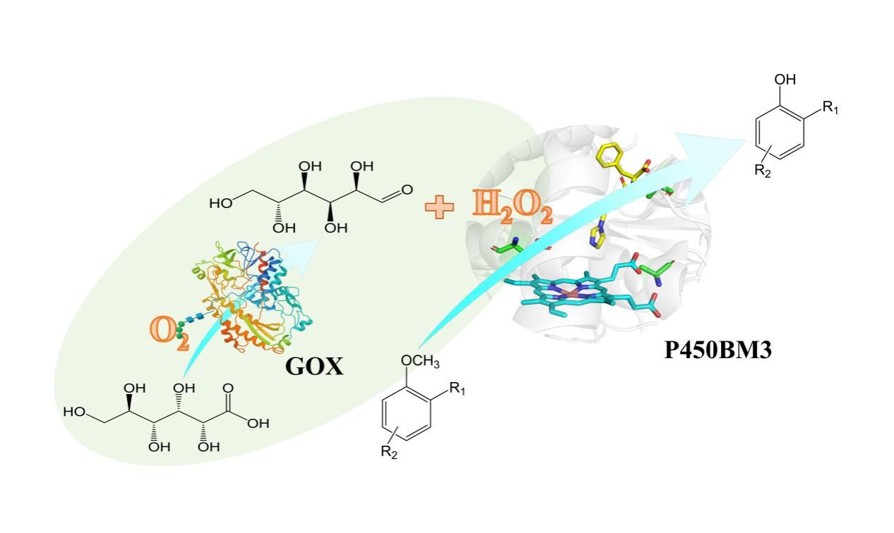 細(xì)胞色素P450BM3/GOx體系催化木質(zhì)素芳香醚單體衍生物脫甲基化示意圖