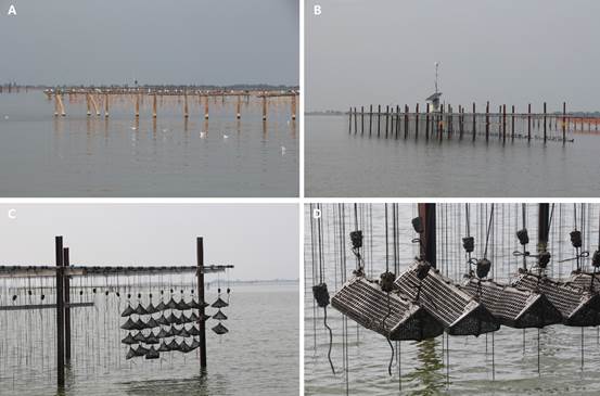 意大利斯嘉德瓦利(Scardovari)海區(qū)貝類養(yǎng)殖設(shè)施,主要由傳統(tǒng)(A)和高密度(B)養(yǎng)殖閥架配以不同形式的網(wǎng)籠和吊繩(C、D)構(gòu)成