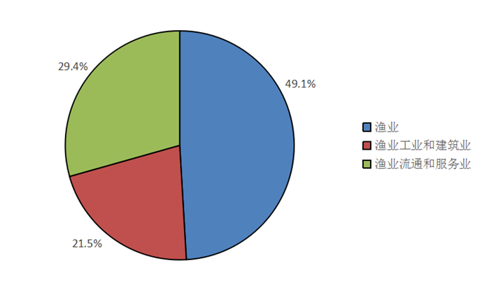 按當(dāng)年價(jià)格計(jì)算,全社會(huì)漁業(yè)經(jīng)濟(jì)總產(chǎn)值27543.47億元,其中漁業(yè)產(chǎn)值13517.24億元,漁業(yè)工業(yè)和建筑業(yè)產(chǎn)值5935.08億元,漁業(yè)流通和服務(wù)業(yè)產(chǎn)值8091.15億元,三個(gè)產(chǎn)業(yè)產(chǎn)值的比例為49.1:21.5:29.4,如圖1所示。漁業(yè)流通和服務(wù)業(yè)產(chǎn)值中,休閑漁業(yè)產(chǎn)值825.72億元,同比下降14.32%。
