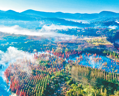 云南省昆明市盤龍區(qū)滇源鎮(zhèn)甸尾村濕地位于松華壩水源保護(hù)區(qū),當(dāng)?shù)亟陙硗ㄟ^種植水杉等方式,充分發(fā)揮濕地凈化水質(zhì)、維護(hù)生物多樣性等功能,有效保護(hù)了生態(tài)環(huán)境。圖為近日甸尾村水杉進(jìn)入最佳觀賞期。