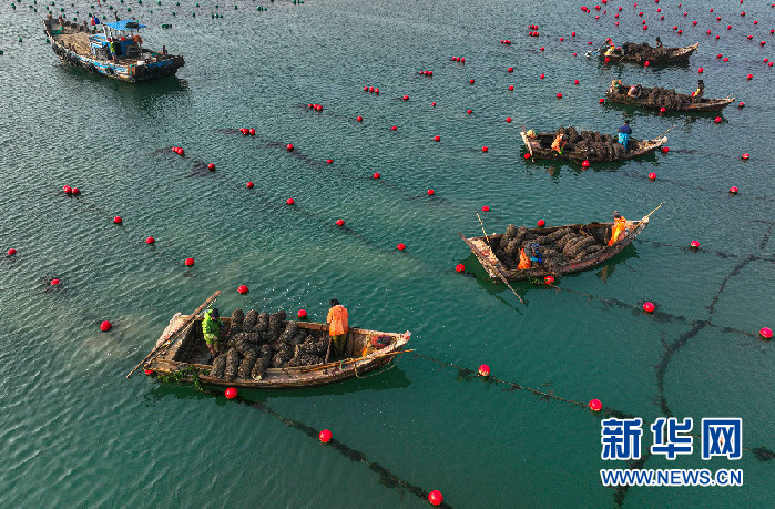 日前,在山東省榮成市愛倫灣海域海上養(yǎng)殖區(qū),漁民們駕駛舢舨穿行在多彩養(yǎng)殖浮漂間進(jìn)行貝類養(yǎng)殖作業(yè)。新華網(wǎng)發(fā)(李信君攝)