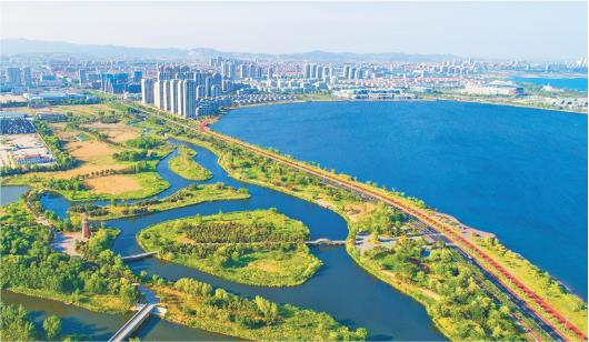 近日,位于膠東半島最東端的榮成市桑溝灣濕地公園綠意盎然,與濱海小城交相輝映,景美如畫。
