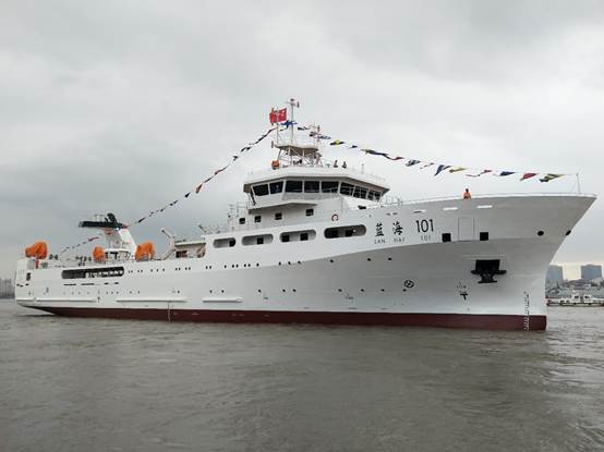 9月12日,黃海水產(chǎn)研究所3000噸級海洋漁業(yè)綜合科學(xué)調(diào)查船“藍(lán)海101”號(與東海水產(chǎn)研究所“藍(lán)海201”號為“一型兩船”)在滬東中華造船(集團(tuán))有限公司正式下水。這標(biāo)志著我國最大的兩艘海洋漁業(yè)綜合科考船主體建造完成,進(jìn)入舾裝階段,不久將以優(yōu)良的船舶性能和強(qiáng)大的科考功能服務(wù)海洋漁業(yè)資源調(diào)查。農(nóng)業(yè)農(nóng)村部黨組成員宋建朝出席活動,并為兩艘新船命名。