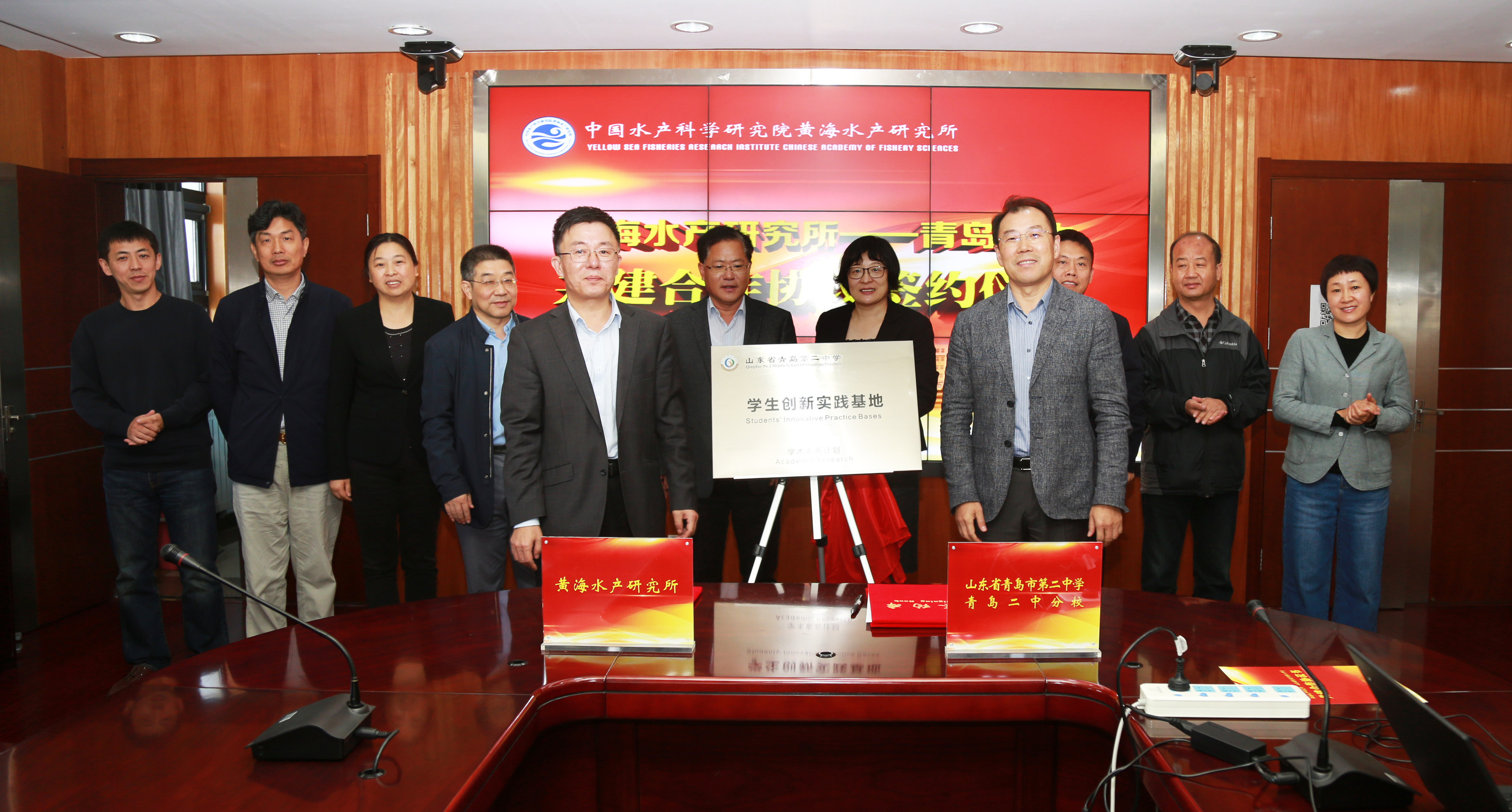 簽約儀式后,金顯仕所長與孫先亮校長共同為青島二中學(xué)生創(chuàng)新實(shí)踐基地揭牌,孫先亮校長一行還實(shí)地參觀了國家水產(chǎn)品質(zhì)量監(jiān)督檢驗(yàn)中心。