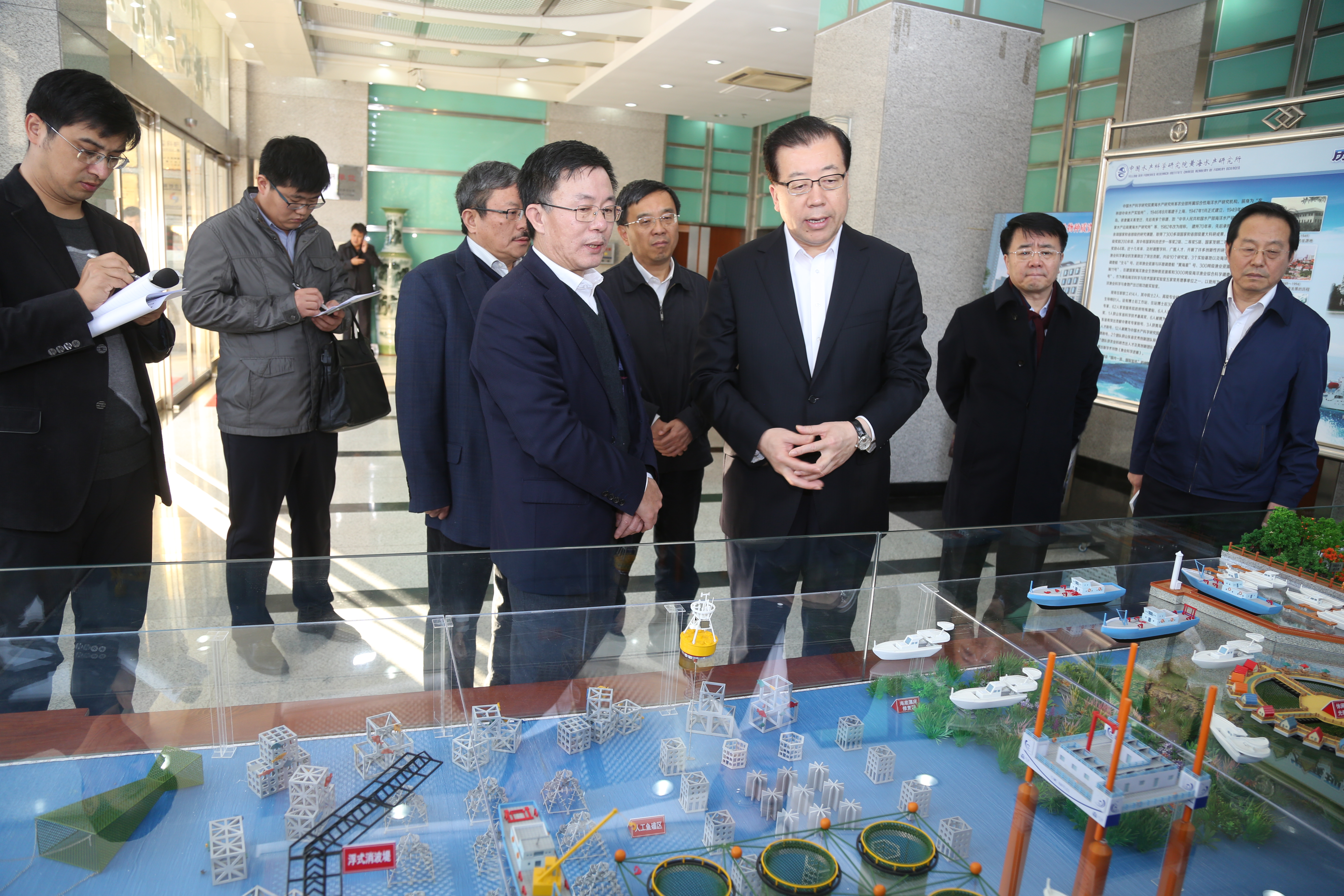 在宣傳展廳,金顯仕所長結(jié)合模型和展板,詳細(xì)介紹了我所在科技研發(fā)、技術(shù)支撐、成果轉(zhuǎn)化、平臺建設(shè)等方面的基本情況,以及服務(wù)山東、服務(wù)青島、服務(wù)產(chǎn)業(yè)等方面的工作;重點(diǎn)匯報(bào)了國家級海洋漁業(yè)生物種質(zhì)資源庫建設(shè)項(xiàng)目、青島海洋科學(xué)與技術(shù)試點(diǎn)國家實(shí)驗(yàn)室建設(shè)以及海洋漁業(yè)調(diào)查船建設(shè)項(xiàng)目等進(jìn)展情況。張江汀書記對我所近年來取得的發(fā)展成就表示充分肯定,并鼓勵(lì)我所把握機(jī)遇、發(fā)揮優(yōu)勢、擔(dān)當(dāng)作為,扎實(shí)做好經(jīng)略海洋這篇大文章,立起藍(lán)色經(jīng)濟(jì)發(fā)展的新標(biāo)桿。