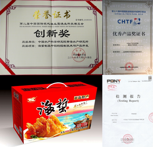 針對海蜇制品中鋁殘留量嚴(yán)重超標(biāo)的問題,黃海水產(chǎn)研究所水產(chǎn)動物精深加工與綜合利用團隊建立了一套完整的海蜇制品中鋁的控制技術(shù)和加工工藝。該技術(shù)具有綠色安全、處理成本低、操作簡便、產(chǎn)品品質(zhì)高等特點。采用該技術(shù)加工的即食海蜇,經(jīng)第三方權(quán)威機構(gòu)檢測,產(chǎn)品中鋁含量均在75 mg/kg以下,大幅低于GB 2760-2014中500 mg/kg的限量值,極大提高了海蜇產(chǎn)品的質(zhì)量安全。該技術(shù)不僅可以有效控制海蜇產(chǎn)品中的鋁含量,同時解決了脫鋁過程會嚴(yán)重破壞產(chǎn)品品質(zhì)的問題,采用該技術(shù)加工的即食海蜇口感脆嫩、有韌性,口感好。與同類技術(shù)相比,該技術(shù)具有明顯的先進性與創(chuàng)新性。該項技術(shù)得到了業(yè)界的廣泛認(rèn)可,2項相關(guān)專利已經(jīng)在企業(yè)進行了專利獨家許可使用和專利權(quán)轉(zhuǎn)讓,并成功在企業(yè)中得到應(yīng)用,起到了很好的示范推廣作用。2018年獲第二屆中國國際現(xiàn)代漁業(yè)暨漁業(yè)科技博覽會“創(chuàng)新獎”。