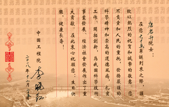 這一天,他收到了中國(guó)工程院院長(zhǎng)李曉紅院士發(fā)來(lái)的生日賀信,“在您七十五華誕到來(lái)之際,謹(jǐn)致以熱烈的祝賀和誠(chéng)摯的敬意。您不負(fù)黨和人民的重托,發(fā)揚(yáng)嚴(yán)謹(jǐn)?shù)目茖W(xué)精神和崇高的道德風(fēng)尚,扎實(shí)工作、開(kāi)拓創(chuàng)新,為我國(guó)科學(xué)技術(shù)事業(yè)發(fā)展、經(jīng)濟(jì)社會(huì)發(fā)展做出了重大貢獻(xiàn),在此衷心祝愿您:生日快樂(lè),健康長(zhǎng)壽!”