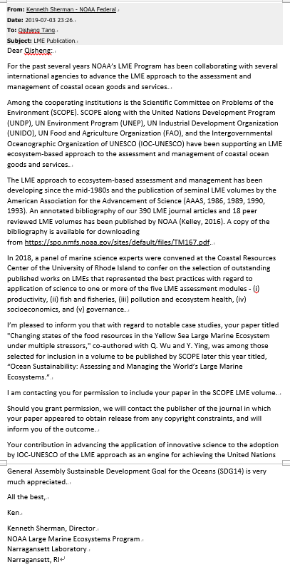 附件:大海洋生態(tài)系之父、86歲高齡的Kenneth Sherman博士致唐啟升院士的郵件,概要介紹了大海洋生態(tài)系發(fā)展歷程、目標(biāo)、關(guān)注點(diǎn)、成果及其相關(guān)網(wǎng)址,供學(xué)習(xí)參考。