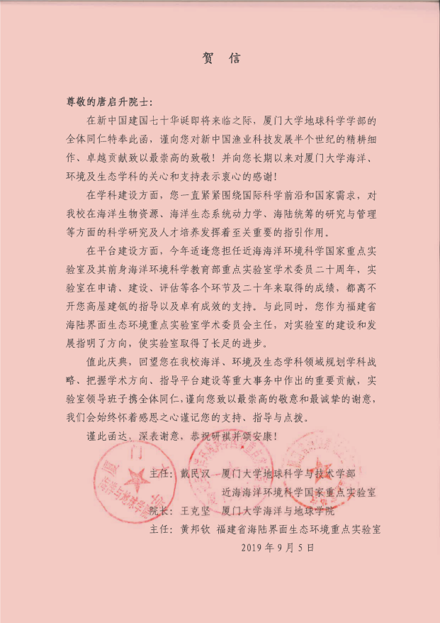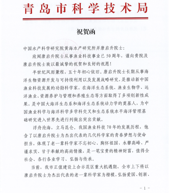 I am privileged to join with your colleagues from China and around the world to extend my best personal congratulations on your 50 year career as a national and international leader in marine fisheries research and management.