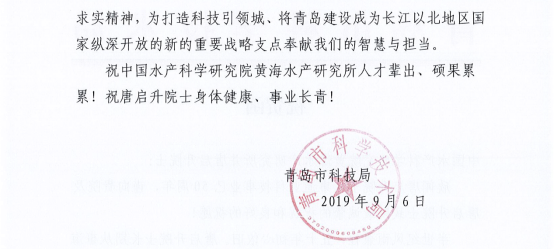 新中國七十華誕將至之際,2019年9月8日由中國水產(chǎn)科學(xué)研究院黃海水產(chǎn)研究所、青島海洋科學(xué)與技術(shù)試點(diǎn)國家實(shí)驗(yàn)室海洋漁業(yè)科學(xué)與食物產(chǎn)出功能實(shí)驗(yàn)室聯(lián)合舉辦的“漁業(yè)科技發(fā)展七十年暨唐啟升院士從事漁業(yè)科學(xué)研究五十周年學(xué)術(shù)論壇”在青島隆重舉行。