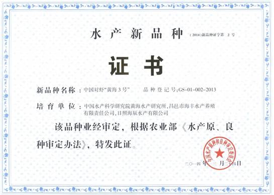 圖1 中國對(duì)蝦“黃海3號(hào)”新品種證書