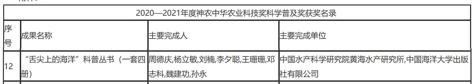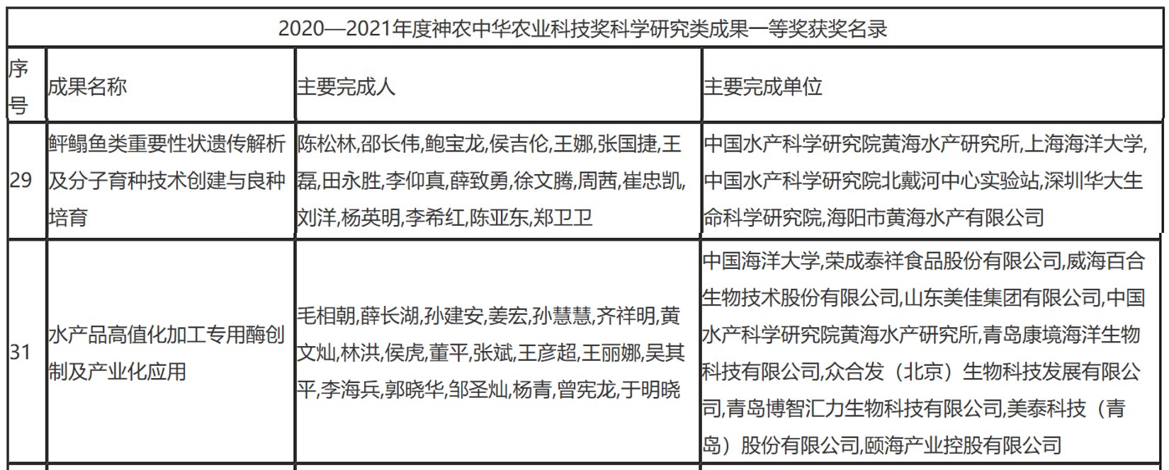 11月1日,農(nóng)業(yè)農(nóng)村部發(fā)布關(guān)于2020-2021年度神農(nóng)中華農(nóng)業(yè)科技獎(jiǎng)的表彰決定(農(nóng)科教發(fā)〔2021〕10號)。中國水產(chǎn)科學(xué)研究院黃海水產(chǎn)研究所陳松林研究員主持完成的“鲆鰨魚類重要性狀遺傳解析及分子育種技術(shù)創(chuàng)建與良種培育”獲神農(nóng)中華農(nóng)業(yè)科技獎(jiǎng)科學(xué)研究類成果一等獎(jiǎng),周德慶研究員主持完成的“《舌尖上的海洋》科普叢書(一套四冊)”獲神農(nóng)中華農(nóng)業(yè)科技獎(jiǎng)科學(xué)普及獎(jiǎng),孫慧慧副研究員參與完成的“水產(chǎn)品高值化加工專用酶創(chuàng)制及產(chǎn)業(yè)化應(yīng)用”成果(第五完成人)獲神農(nóng)中華農(nóng)業(yè)科技獎(jiǎng)科學(xué)研究類成果一等獎(jiǎng)。