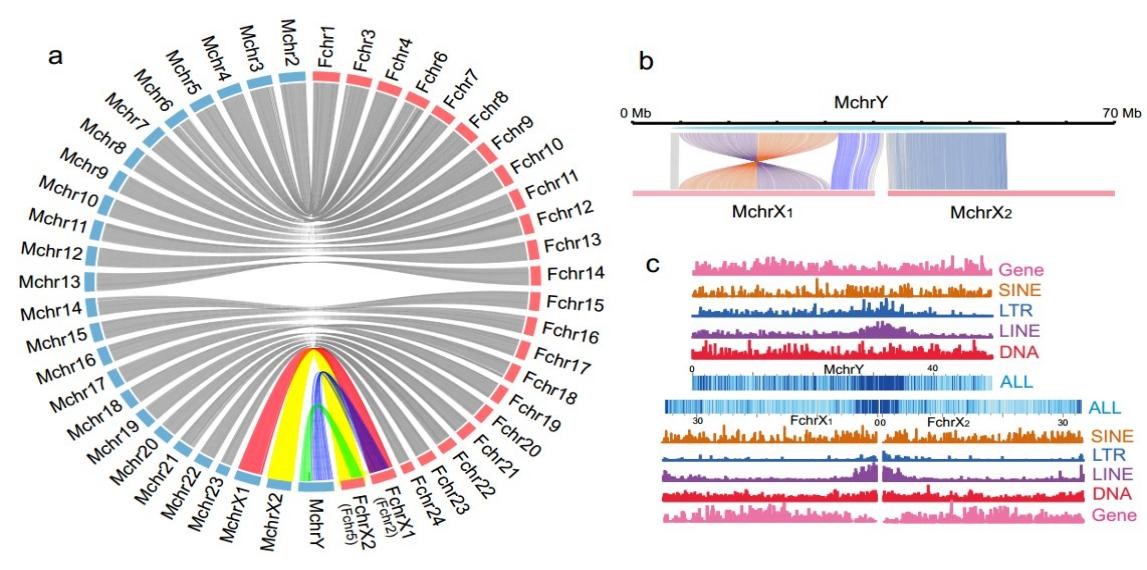 斑石鯛是我國新興的重要海水養(yǎng)殖魚類,具有復性染色體特征,其雌魚具有22對常染色體和X1X1X2X2性染色體,而雄魚則具有22對常染色體和X1X2 Y性染色體,是研究魚類性染色體起源與進化的理想材料。黃海水產(chǎn)研究所海水魚類基因組學及分子育種技術(shù)創(chuàng)新團隊結(jié)合BGI-500、Nanopore、PacBio和Hi-C等技術(shù),率先完成斑石鯛雌魚和雄魚染色體水平基因組精細圖譜繪制。利用三代和重測序數(shù)據(jù)獲得單倍型信息,將斑石鯛Y染色體非同源重組區(qū)進行精確組裝。結(jié)構(gòu)分析表明Y染色體上存在一個約23.5 Mb的倒位,推測其在性別決定基因的產(chǎn)生和性染色體的進化過程中發(fā)揮重要作用。