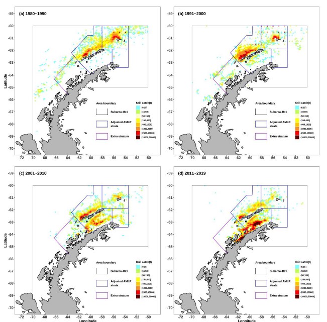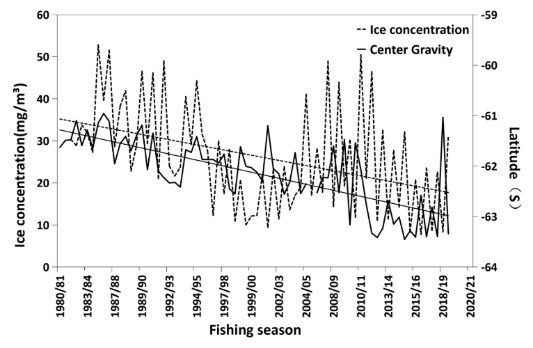 全球氣候變化背景下,南極磷蝦漁業(yè)逐漸向島嶼近岸收縮并呈現(xiàn)局地集中的趨勢,國際上對漁業(yè)過度集中可能造成局地企鵝、海豹和須鯨等高營養(yǎng)級生物攝食需求的擔憂日益增強。黃海水產(chǎn)研究所極地漁業(yè)資源開發(fā)利用創(chuàng)新團隊通過對海冰、漁業(yè)和聲學數(shù)據(jù)的綜合分析,發(fā)現(xiàn)近40年南極半島海域磷蝦漁業(yè)重心緯向分布與海冰覆蓋度年際變化趨勢基本一致;證實磷蝦資源分布具有高度集中及顯著季節(jié)/年際變化特征,指出磷蝦漁場收縮與集中是其對磷蝦分布特征認知能力提升的自然反應;揭示局地捕撈熱區(qū)內(nèi)的磷蝦生物量在冬初明顯高于甚至數(shù)倍于捕食者對磷蝦需求最高的夏季,表明磷蝦漁業(yè)沒有對當?shù)亓孜r種群或捕食者對其生物量需求造成影響。研究成果提交至南極海洋生物資源養(yǎng)護科學委員會及其科學工作組獲得認可,為南極磷蝦新漁業(yè)管理措施的制定提供了重要的基礎科學依據(jù)。