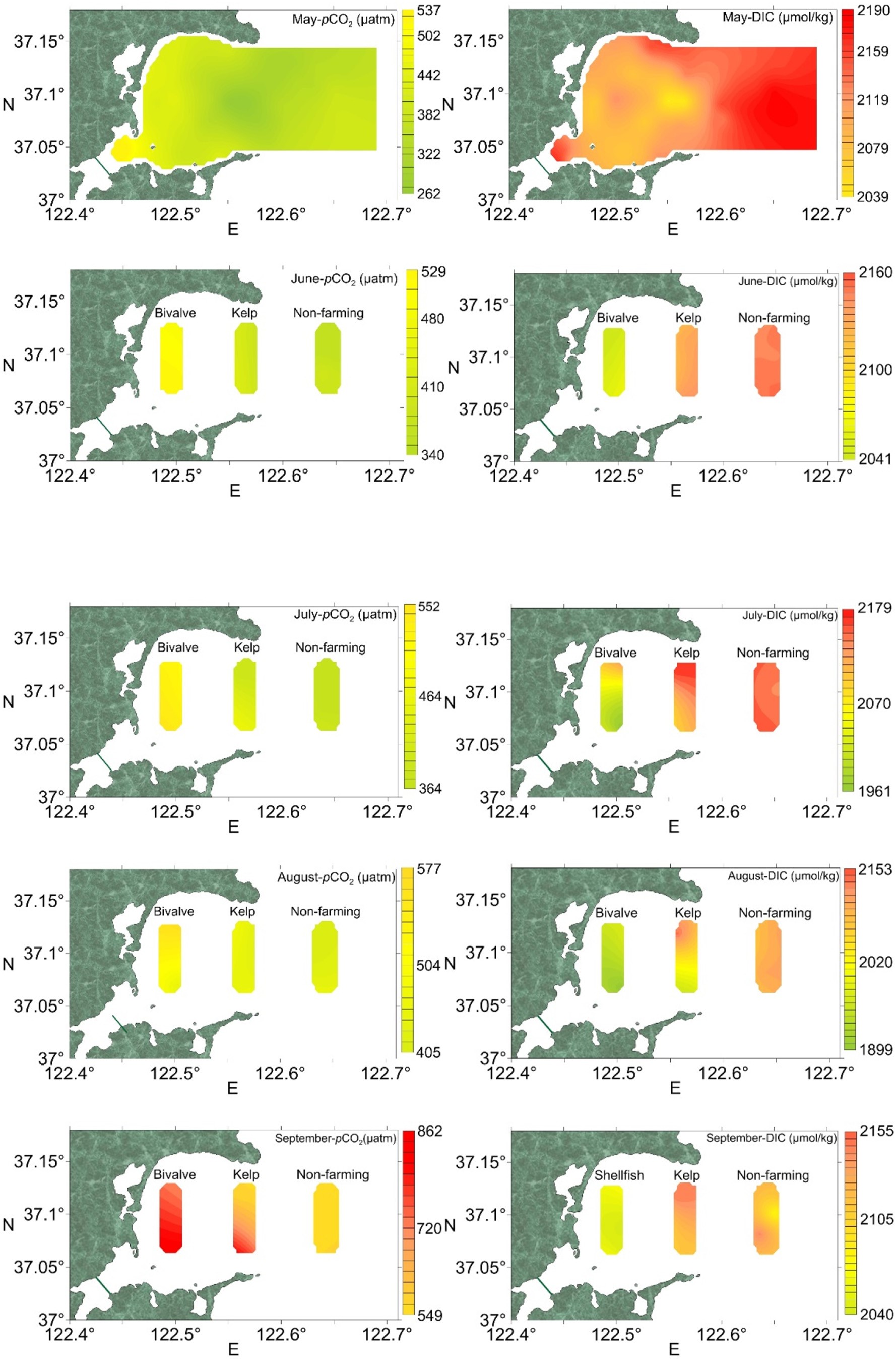5-9月桑溝灣不同養(yǎng)殖區(qū)(貝類和海帶養(yǎng)殖區(qū))和灣外(非養(yǎng)殖區(qū))的表層海水的pCO2(μatm)和溶解無機碳(DIC)(μmol·kg-1)的等值線圖。