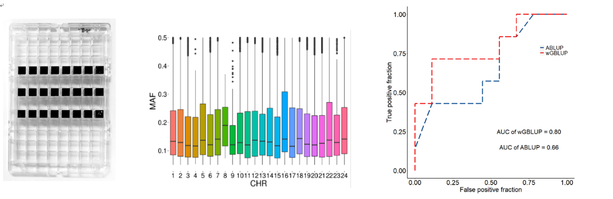 魚類種質(zhì)資源與分子育種創(chuàng)新團隊在前期完成1000多個半滑舌鰨個體全基因組重測序的基礎上,自主設計了SNP位點篩選策略,整合了抗哈維氏弧病、生長等性狀相關位點,選取38295個SNP,聯(lián)合Affymetrix公司研制了基因芯片“鰨芯1號”,建立了基于基因芯片的半滑舌鰨抗病基因組選擇育種技術(shù),并應用于抗細菌病良種選育,為抗病良種培育提供了技術(shù)支撐。相關成果在Genomics發(fā)表。