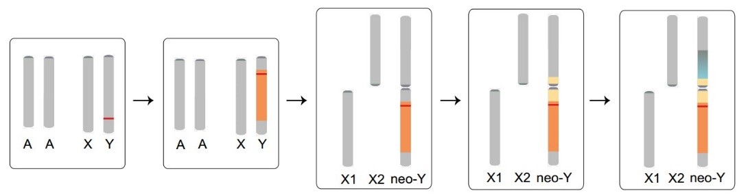 該研究推演了新Y(neo-Y)性染色體的起源與進化軌跡。進化分析表明,Y染色體上新融合進來的部分在融合后才產(chǎn)生重組抑制,推斷neo-Y的形成是原始的Y染色體與一條常染色體融合而來。同時揭示了精巢和卵巢發(fā)育過程中性染色體基因的時空表達特征,鑒定了性染色體上性腺發(fā)育相關重要基因。斑石鯛neo-Y和X染色體的高質(zhì)量組裝,為理解復性染色體魚類性別決定機制和性染色的進化提供了寶貴的遺傳資源。研究結(jié)果發(fā)表于Molecular Biology and Evolution。