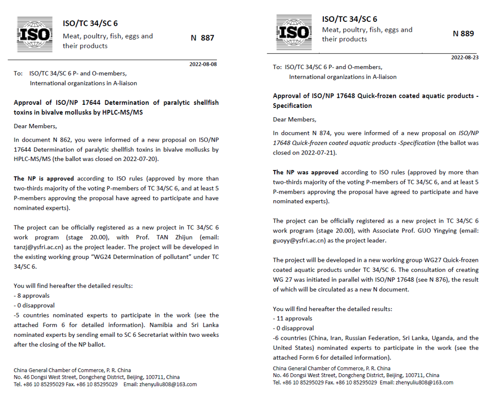 8月8日,由中國水產(chǎn)科學研究院黃海水產(chǎn)研究所主導申報的2項ISO國際標準項目提案ISO/NP 17644《雙殼貝類中麻痹性貝類毒素(PSTs)的測定 液相色譜-串聯(lián)質譜法(Determination of paralytic shellfish toxins in bivalve mollusks by HPLC-MS/MS)》和ISO/NP 17648《速凍裹衣水產(chǎn)制品(Quick-frozen coated aquatic products—Specification)》,經(jīng)過ISO/TC34/SC6秘書處組織的為期2個多月新項目提案(NP)投票正式獲批立項,目前進入工作組草案(WD)階段。兩項標準分別由譚志軍研究員和郭瑩瑩副研究員牽頭制定。