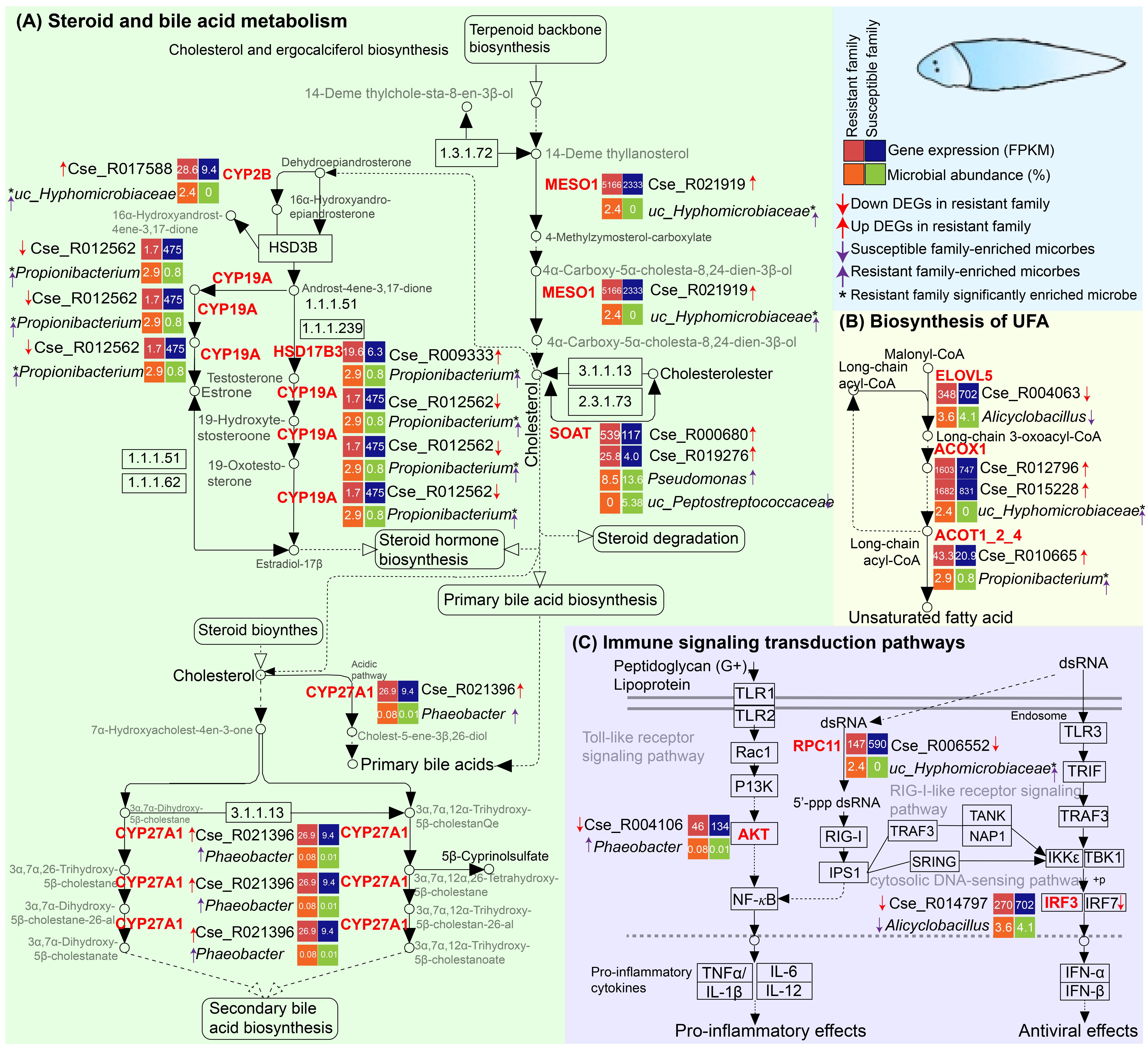 本研究基于陳松林院士團(tuán)隊(duì)多代選育的半滑舌鰨抗病家系,通過(guò)多組學(xué)分析,解析了抗病和易感家系腸道菌群的結(jié)構(gòu)功能差異、宿主基因表達(dá)模式和菌群-宿主相互作用,發(fā)現(xiàn)抗病和易感家系微生物群落結(jié)構(gòu)具有明顯差異:抗病家系通過(guò)招募有益菌(如Phaeobacter,Propionibacterium)增強(qiáng)抗弧菌感染能力,而易感家系則由于富集了促炎菌(如Alicyclobacillus)而影響了抗病力。進(jìn)一步分析發(fā)現(xiàn),腸道微生物通過(guò)調(diào)控宿主代謝(包括類固醇、類固醇激素、膽汁酸合成和不飽和脂肪酸代謝途徑)和免疫信號(hào)通路(包括DNA-sensing,Toll-like和RIG-I-like受體信號(hào)通路)等影響半滑舌鰨抗弧菌感染能力。此外,發(fā)現(xiàn)腸道菌群可能通過(guò)“菌-腸-免疫軸”調(diào)控宿主的免疫穩(wěn)態(tài)和炎癥反應(yīng),如Phaeobacter通過(guò)調(diào)控自身hdhA基因和宿主膽汁酸生物合成通路cyp27a1基因上調(diào),同時(shí)調(diào)控自身trxA基因和宿主促炎細(xì)胞因子生物合成通路akt基因的表達(dá)下調(diào),來(lái)降低抗病家系的炎癥反應(yīng),從而提高半滑舌鰨抗弧菌感染能力。在此基礎(chǔ)上,本研究進(jìn)一步篩選到基于腸道微生物和宿主基因組合的生物標(biāo)志物,可用于半滑舌鰨抗病種質(zhì)篩選。