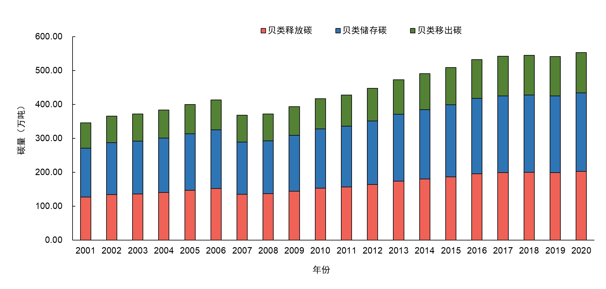 圖2.近20年(2001—2020)我國海水貝類養(yǎng)殖碳匯能力年際變化